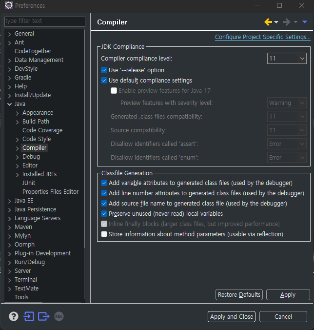 eclipse에서 window - preferences - compiler에서 level을 동일하게 11로 변경해준다.