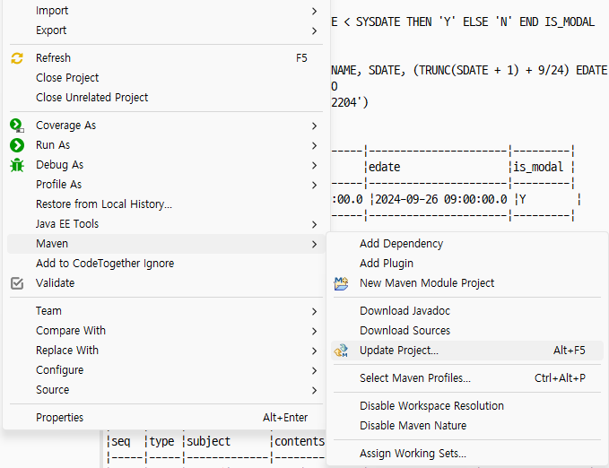 - 프로젝트 > 오른쪽마우스 > Maven > update project